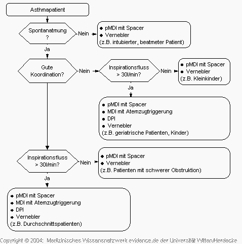 Seit mehr als vierzig Jahren werden Dosieraerosole zur inhalativen Medikamentenapplikation in der Therapie des Asthma bronchiale eingesetzt. Dosieraerosole generieren Tröpfchen von 20-40 µm Größe, die durch das Verdampfen des Treibgases bei gleichzeitiger mit Abkühlung einhergehender adiabatischer Expansion rasch schrumpfen. Das zu applizierende Medikament liegt bereits in mikronisierter lungengängiger Größe vor (ca. 4 µm). Der überwiegende Teil des applizierten Medikaments bleibt durch Impaktion im Oropharynx liegen, da die großen Teilchen der Richtung des Inspirationsflusses nicht folgen können. Durch Spacersysteme kann dies zumindest teilweise verhindert werden. Der Anteil des intrapulmonal deponierten Medikaments beträgt bei Beta2-Sympathomimetika ca. 30 % der applizierten Gesamtdosis. Ein Dosieraerosol sollte mit langsamer gleichmäßiger Inspiration und anschließendem Luftanhalten inhaliert werden. Eine Erhöhung des inspiratorischen Flusses von 20 auf 80 l/min führt zu einer Abnahme der Lungendeposition um ca. 50 %.